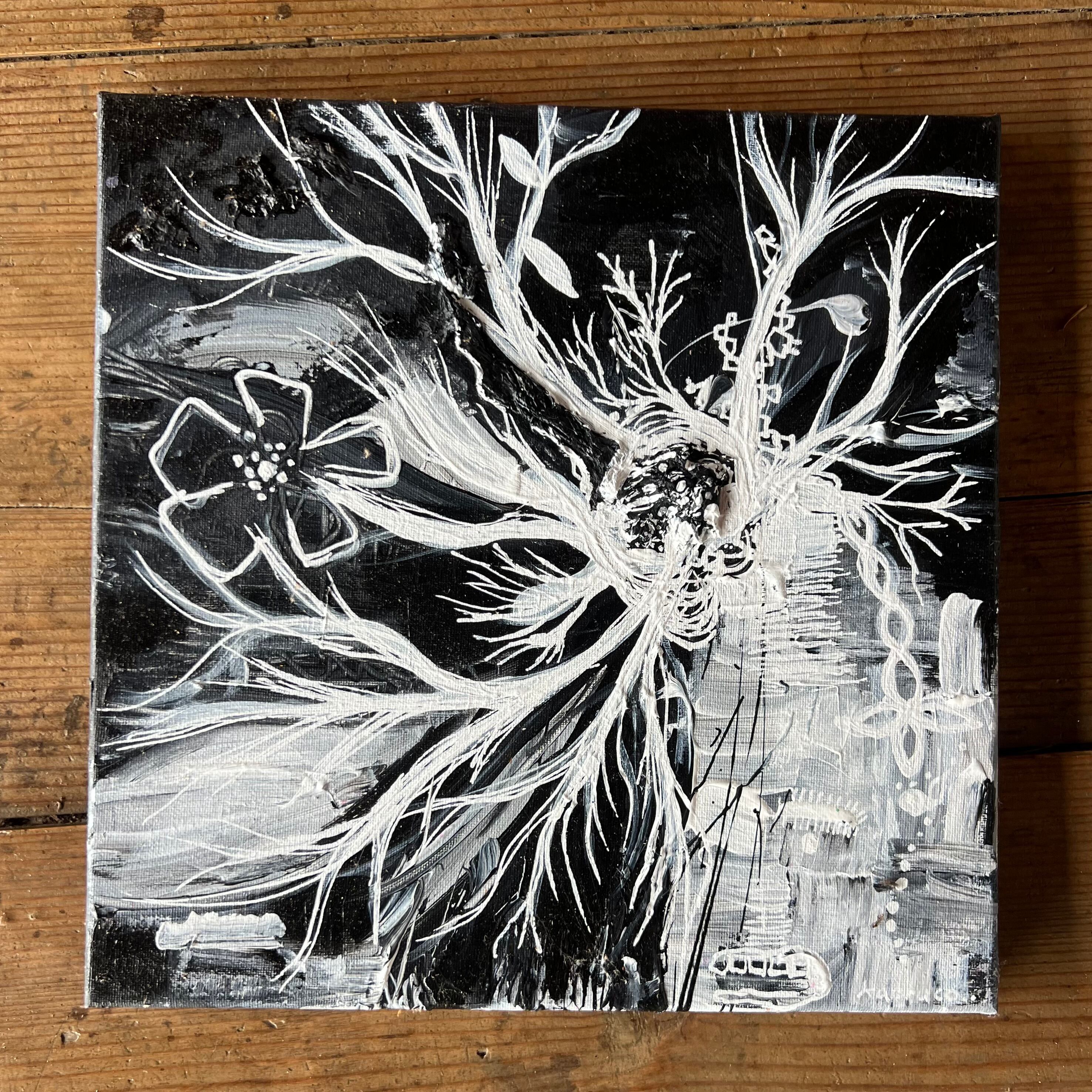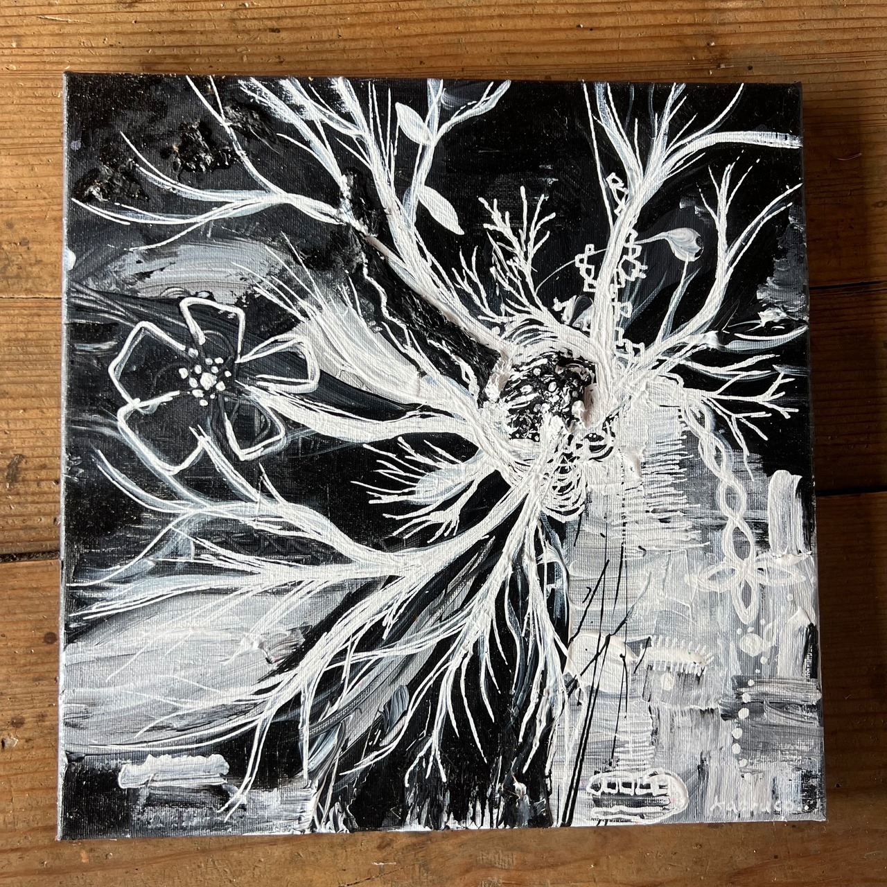 アクリル絵の具、修正ペンで描いています。